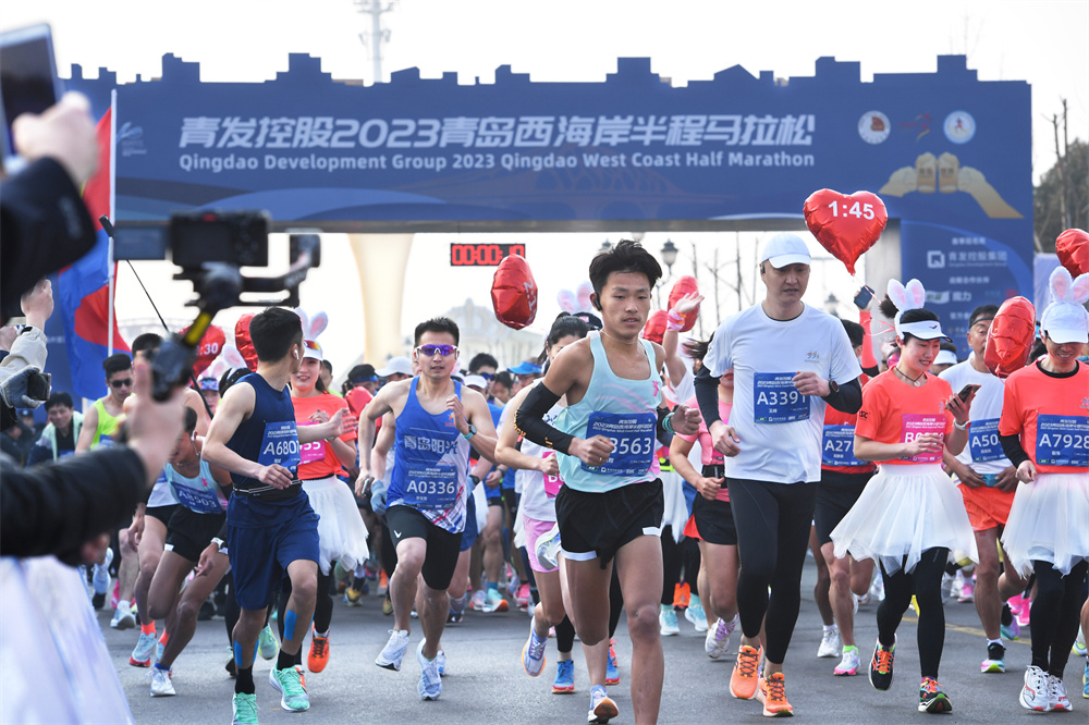 當日,2023青島西海岸半程馬拉松鳴槍起跑,此次賽事分為半程馬拉松和5公里健康跑兩個組別。 新華社記者 李紫恒 攝
