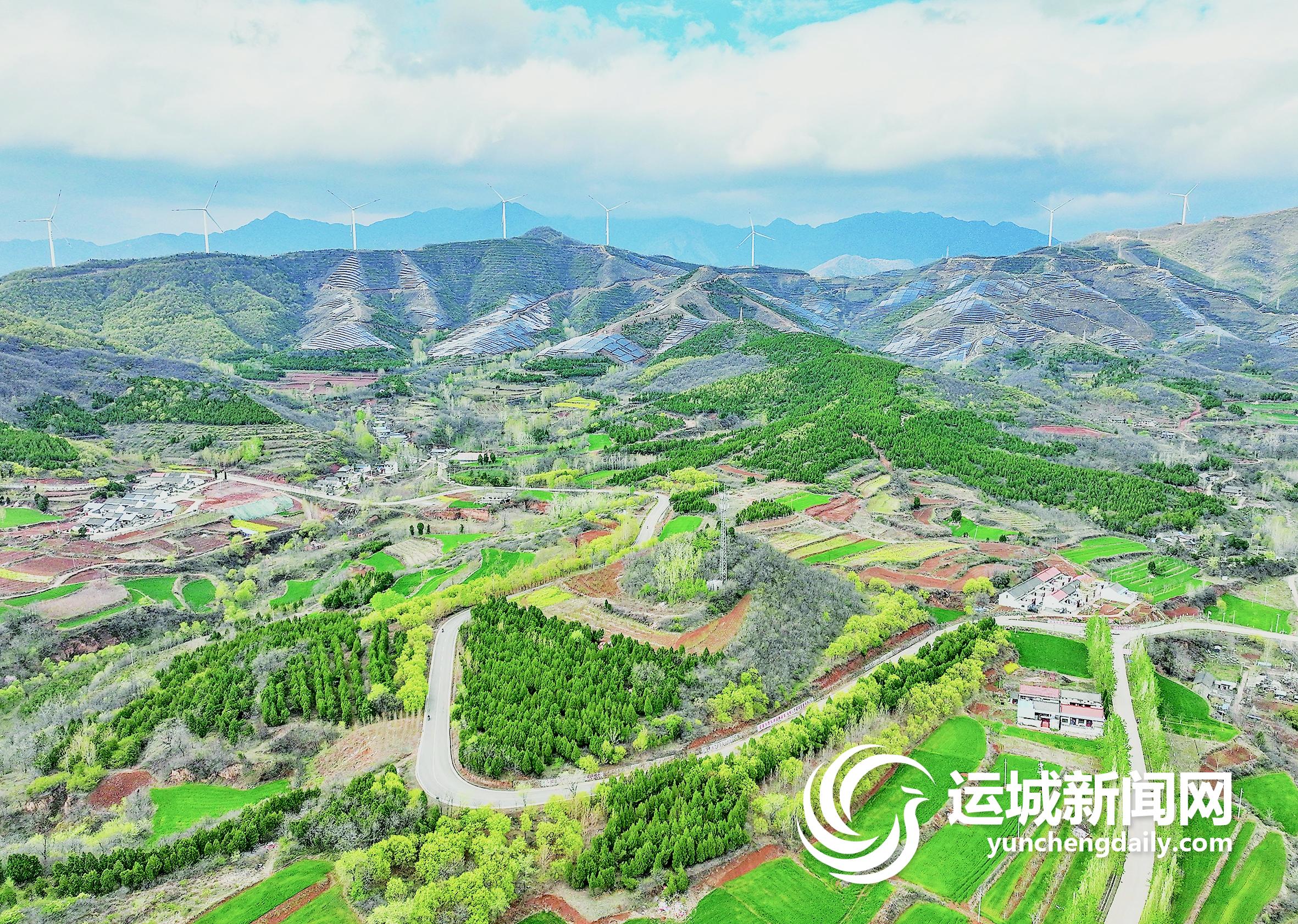 4月4日,雨后初晴的垣曲縣,山野間嫩綠的喬木、翠綠的麥田和松柏與遠山、民房、道路相映成趣,構成一幅美麗的嶄新畫卷。