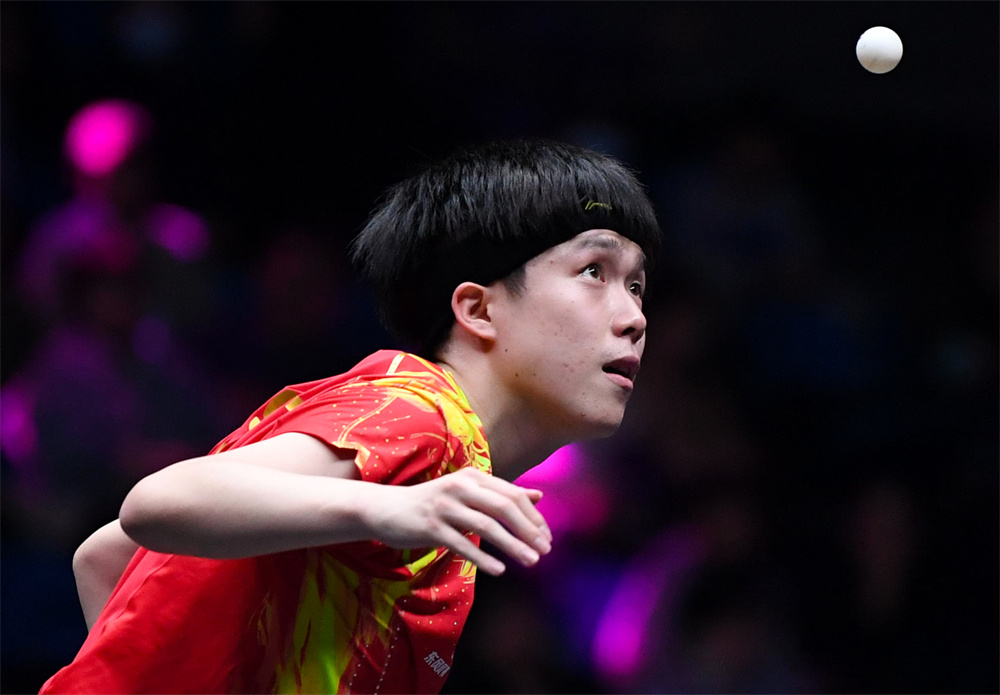 4月12日,王楚欽在比賽中發球。新華社記者 郝源 攝