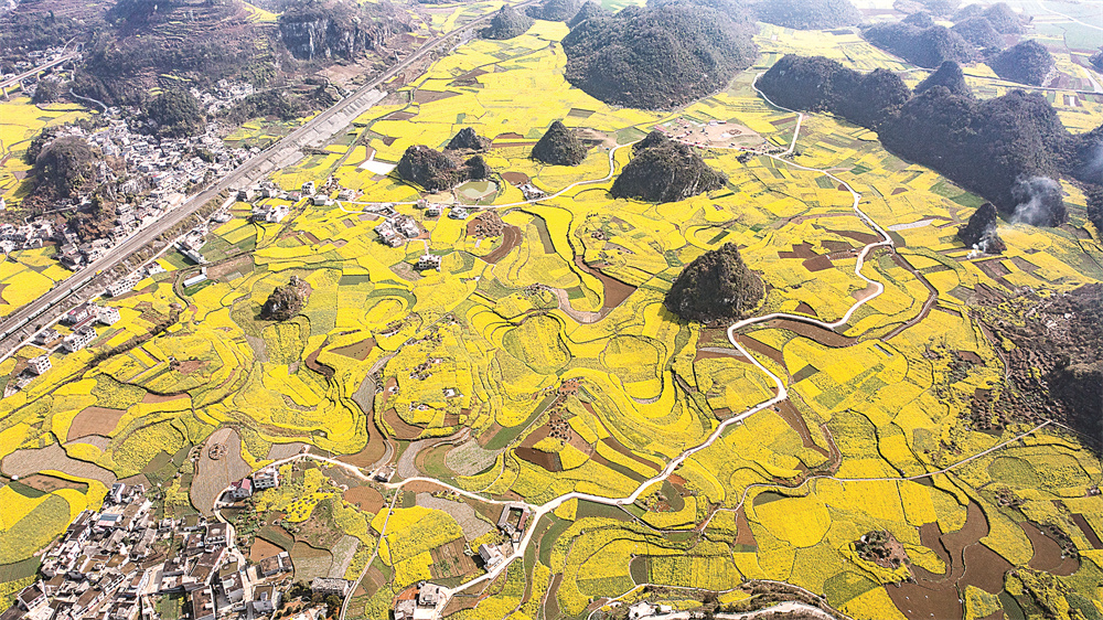 ▲這是近日拍攝的貴州省六盤水市六枝特區(qū)的油菜花田。