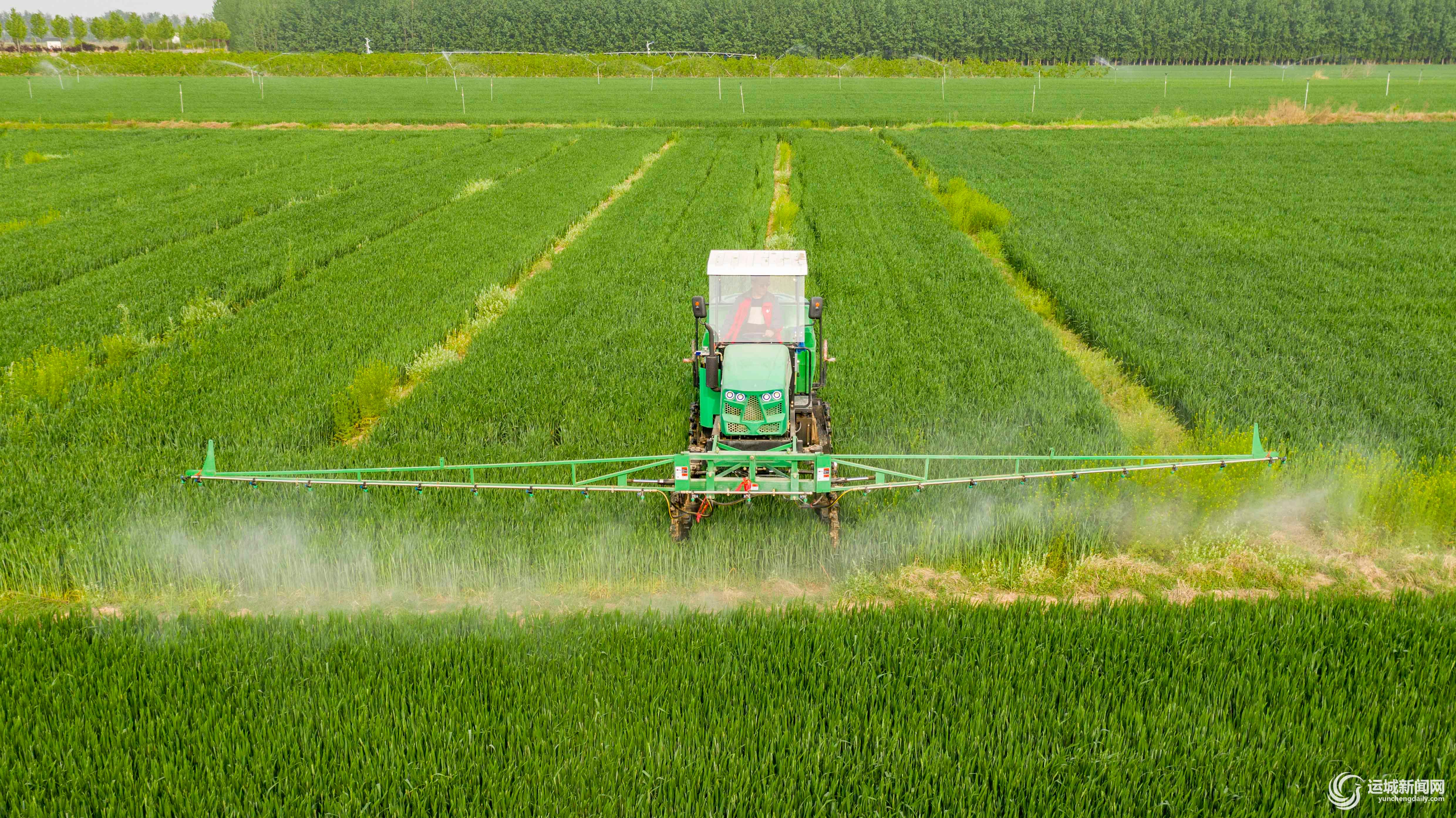 4月18日,在芮城縣東壚鄉遠鵬家庭智慧農場里,農戶駕駛植保機械對麥田進行噴藥。