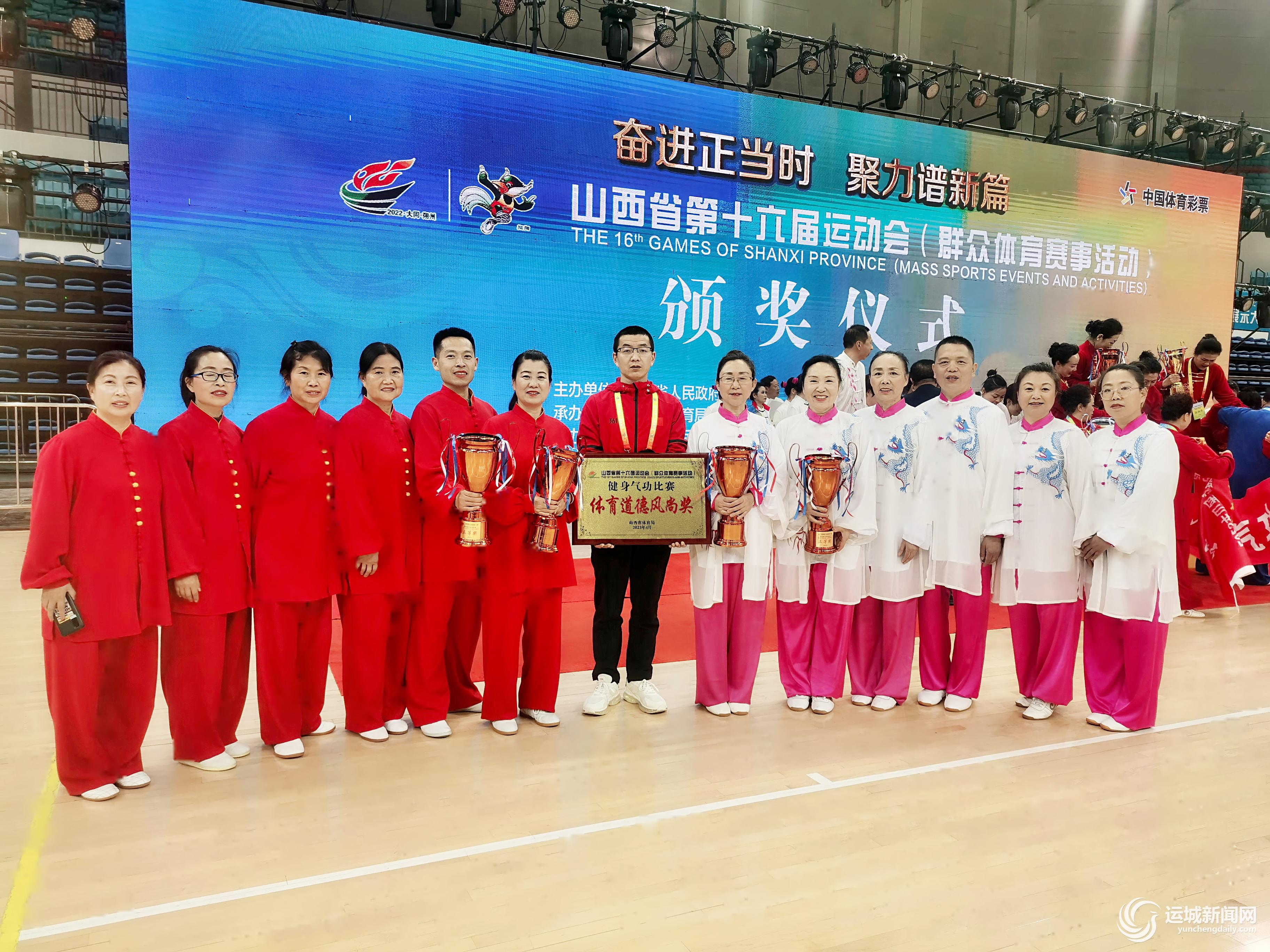 運城晚報訊(記者 杜磊)4月18日,山西省第十六屆運動會(群眾體育賽事活動)健身氣功比賽,在大同市體育中心體育館拉開帷幕,這是本屆省運會的首項群眾體育賽事。我市代表隊以積極進取的精神風貌和頑強拼搏的體育精神,奪得健身氣功易筋經三等獎、健身氣功八段錦三等獎、健身氣功導引養生功十二法三等獎和健身氣功大舞三等獎。運城市體育局榮獲“體育道德風尚獎”。
