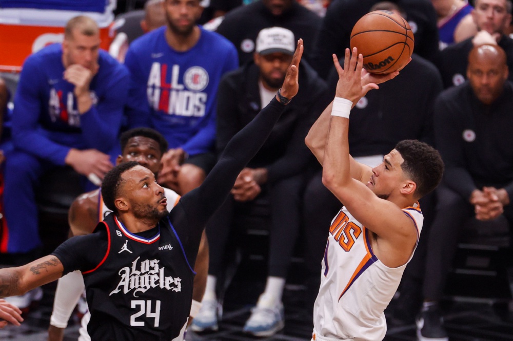 4月22日,太陽隊球員德文·布克(右)在快船隊球員諾曼·鮑威爾防守下投籃。當日,在2022~2023賽季NBA季后賽首輪第四場比賽中,菲尼克斯太陽隊客場以112比100戰勝洛杉磯快船隊,總比分3比1領先。 新華社發(趙漢榮 攝)