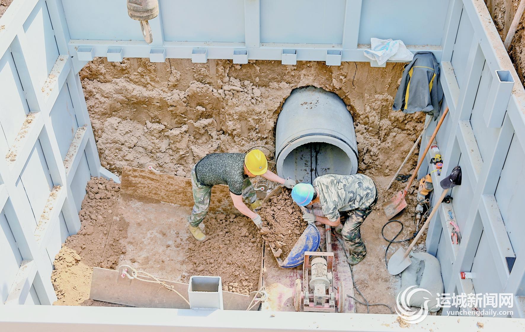 5月2日,夏縣水頭工業園區改造建設項目工地,工人在進行雨水管道施工作業。