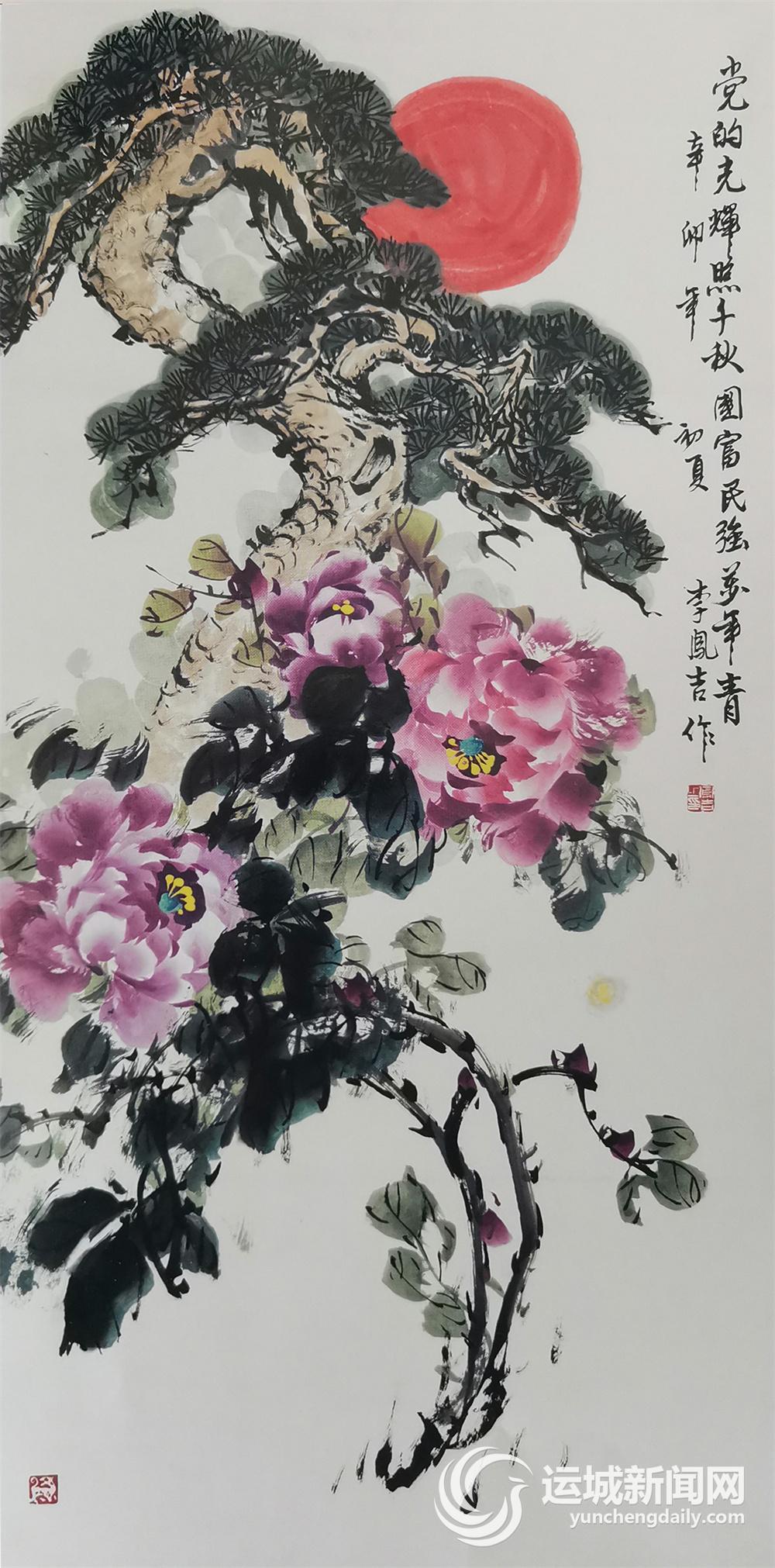 在他出版的專輯《李鳳吉寫意牡丹畫集》一書中,有一幅《黨的光輝照千秋 國富民強(qiáng)萬年青》的作品。該作品以牡丹打底,牡丹之上繪有青松,青松之上一輪紅日。“紅日、青松象征著我黨歷經(jīng)百年風(fēng)雨,依然風(fēng)華正茂;牡丹則寓意黨的領(lǐng)導(dǎo)下,國泰民安,人民群眾的生活越來越好。”