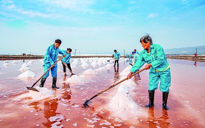 工人在運城鹽湖鏟收原鹽。薛俊攝/光明圖片