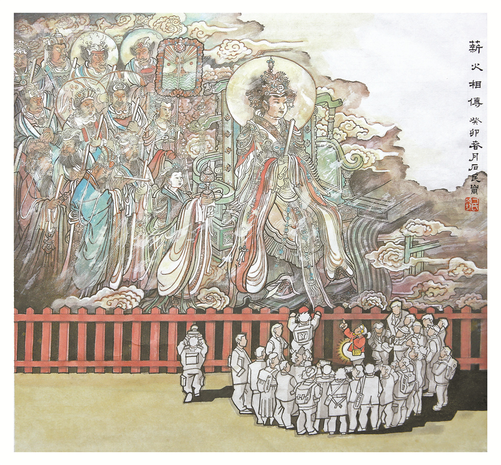 于是,一幅名為《薪火相傳》漫畫作品誕生了。畫面的構成很簡單:映入眼簾的就是永樂宮壁畫,壁畫前是參觀人群,人群中佇立著一名懷孕的講解員。