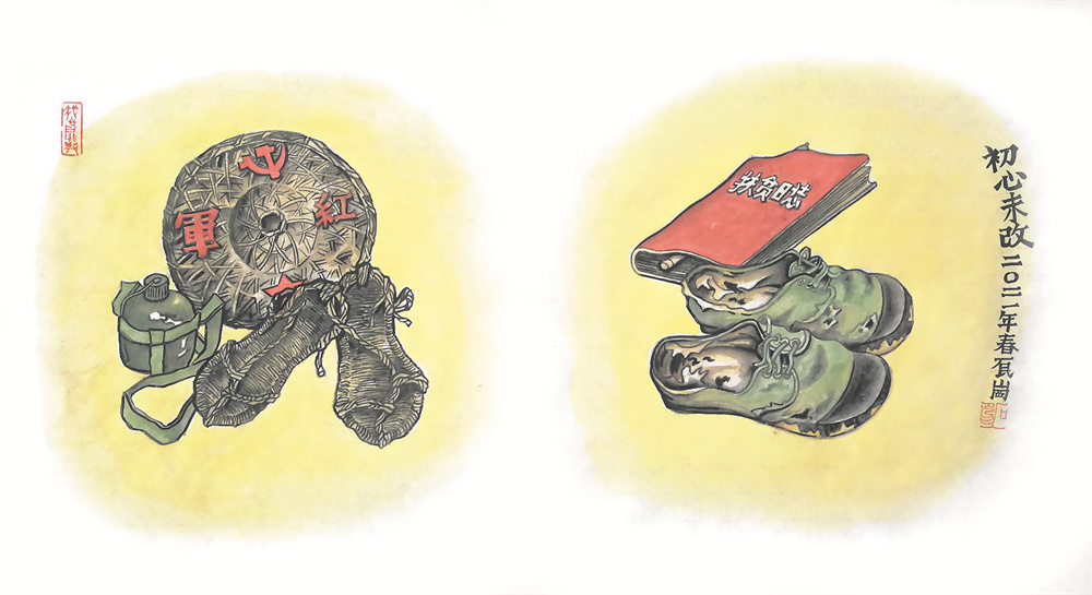 石民崗特別提到了作品《初心未改》。這是一幅通俗易懂又充滿意蘊的漫畫。這幅漫畫由兩個畫面組成,一個畫面是紅軍時代的草帽、草鞋和軍用水壺,另一個畫面是穿破的球鞋和扶貧日志。“任時代如何變化,共產黨人的初心和使命一直不改;它也在告訴大家,走得再遠,也不能忘記來時的路。”業界人士這么評價。