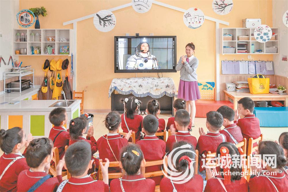 ▲5月30日上午,鹽湖區第二實驗幼兒園內,教師帶領幼兒通過電視觀看神舟十六號載人飛船發射。