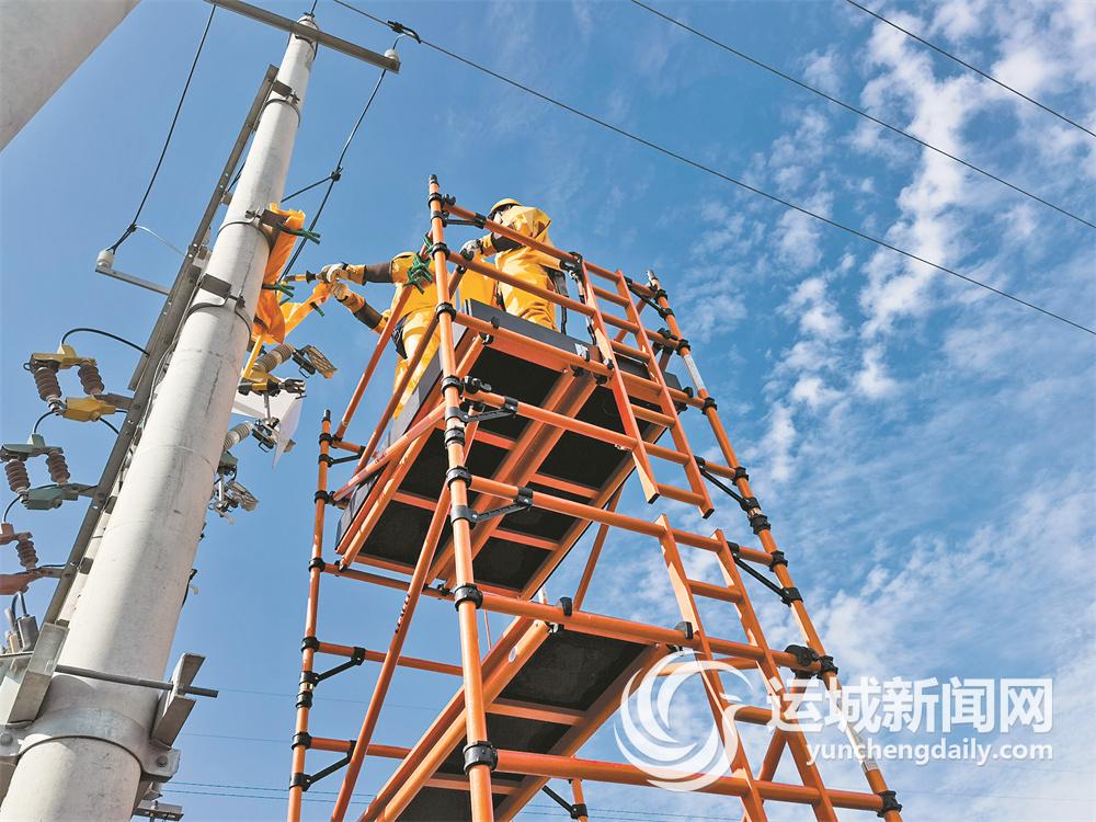 為確保供電安全,7月8日,國網運城供電公司工作人員,冒著酷暑頂著烈日,在永濟市開張鎮10千伏供電線路上帶電更換發熱的線夾,消除設備隱患,保障周邊1800戶居民生產生活用電。 特約攝影 裴鵬飛 攝