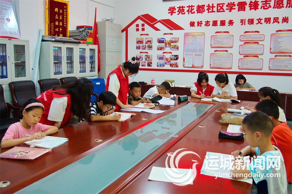 暑假期間,學苑花都社區聯合鹽湖區青年志愿者協會,組織以大學生為主的志愿者,為轄區內中小學生提供免費暑期作業輔導。