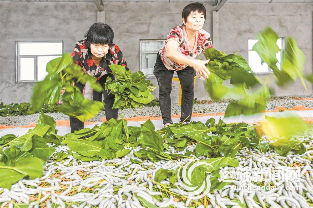 8月5日,蠶農在夏縣尉郭鄉西陰村一處蠶房內向蠶投喂桑葉。