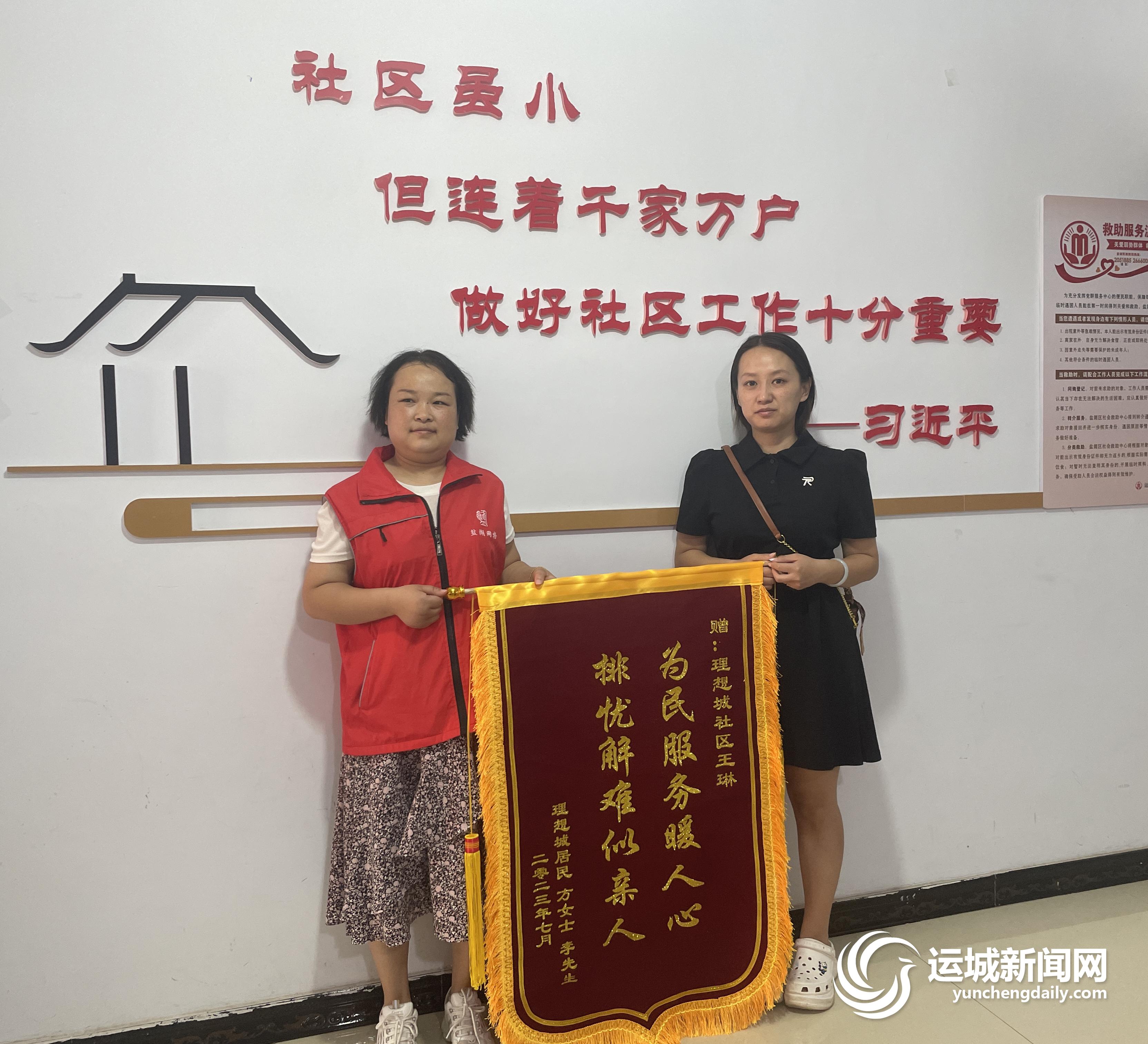 方女士來(lái)到理想城社區(qū)黨群服務(wù)中心,為王琳送上錦旗,以表感謝。