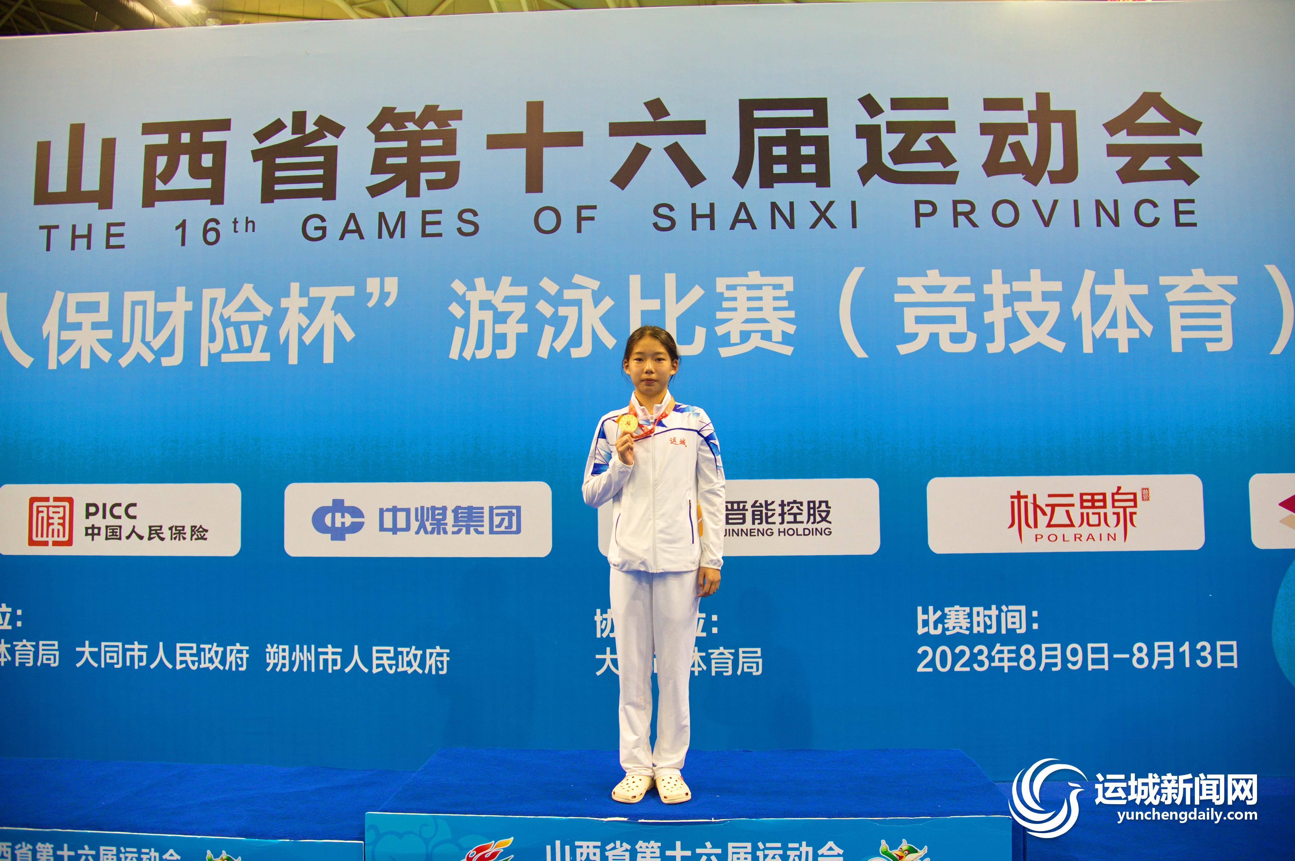 運城晚報大同訊(記者 杜磊)放飛激情,拼搏賽場。8月10日晚,在省運會競技體育游泳比賽女子U13組400米自由泳決賽中,運城運動員王子嫣不畏強手、頑強拼搏,以4分33秒99的佳績?yōu)槲沂汹A得一枚金牌(上圖)。這是我市游泳項目在本屆省運會上收獲的首枚金牌。