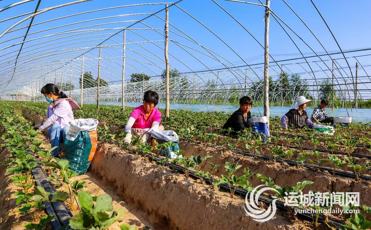 9月5日,夏縣裴介鎮錦銀農業種植專業合作社里,員工給新栽的草莓秧苗疏葉。