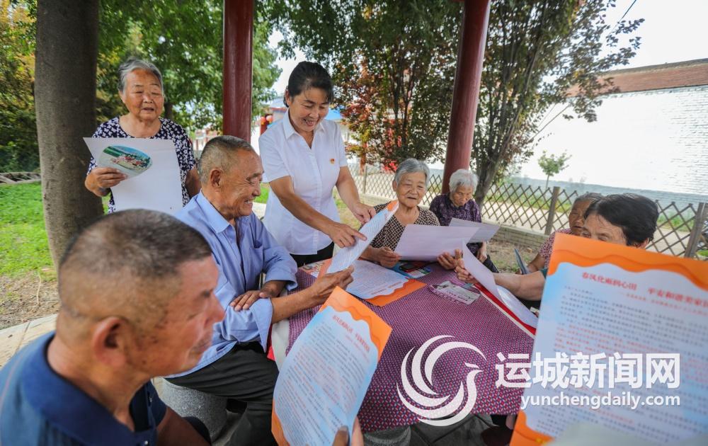8月29日,聞喜縣桐城鎮邱村黨支部書記、村委會主任李菊香在小游園內向村民宣傳講述家風家教相關內容。