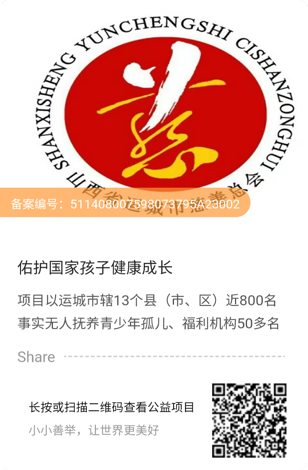 公益寶平臺是慈善互聯網公開募捐服務商。近日,由運城市民政局倡議指導,依托13個縣(市、區)民政局、未成年人保護救助中心、運城市社會福利院具體執行實施的“佑護國家孩子健康成長”項目,在公益寶平臺上線,運城市慈善總會為該項目款物捐贈唯一接收機構。
