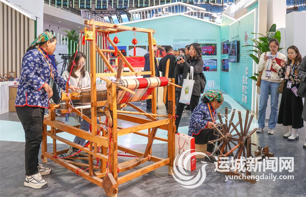 永濟市惠暢文化創意有限公司此次就把織布機和紡線車帶到了現場。永濟織布技藝是國家級非物質文化遺產,員工們現場紡線、織布,吸引了很多參觀者(上圖)。不少人躍躍欲試,該公司員工就手把手教他們,告訴他們紡線時手上力度如何掌握,織布何時踩踏板、快速穿過梭子、拉緊繩線……“哎呀,又斷了……”“成功了!”現場歡笑聲不斷,好不熱鬧。