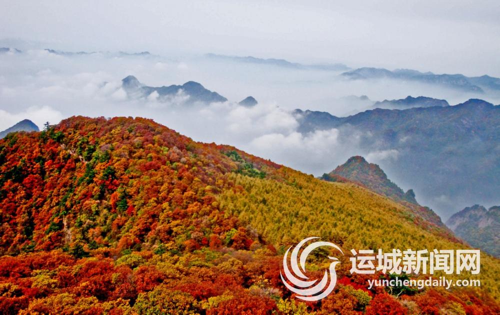 遙望中條,秋楓紅醉,青松蒼翠,紅綠相映,層林盡染,疊翠流金,云海浮動,千里如錦,山河壯麗。