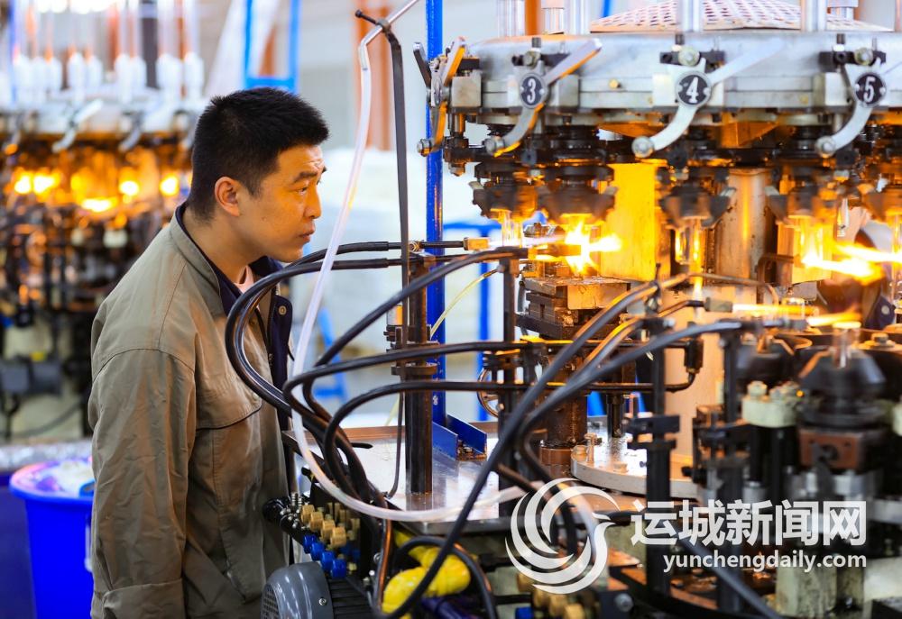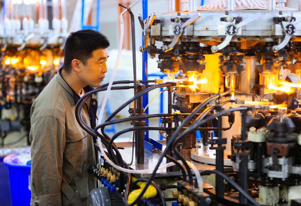 在宏光醫用玻璃股份有限公司生產車間內,工人在生產管制瓶產品。