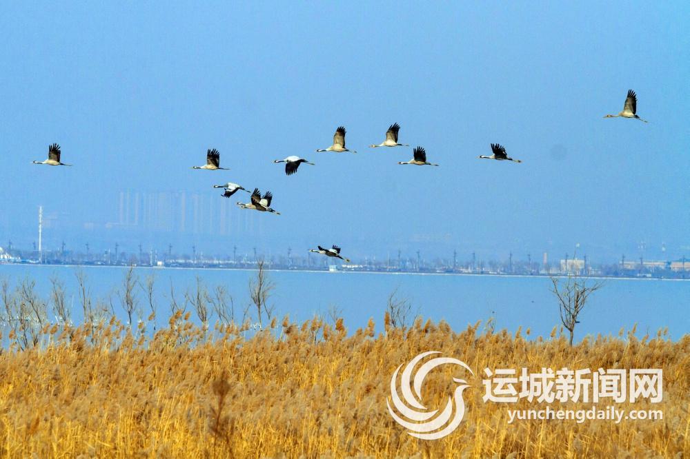 近年來,隨著我市對鹽湖生態環境修復保護力度的持續加大,生態環境持續改善,吸引了眾多水禽、野生鳥類在此棲息越冬。圖為近日拍攝的灰鶴在鹽湖上空飛舞的場景。 特約攝影 姜 樺 攝