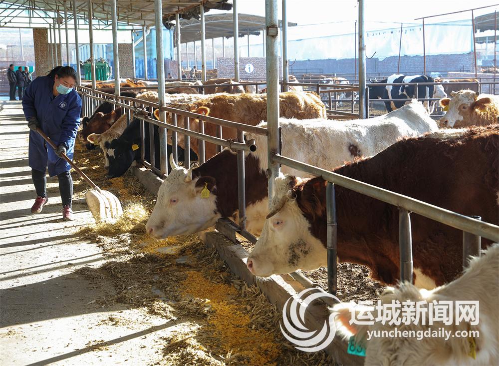 12月9日,在萬榮縣向陽牧業有限公司肉牛飼養場,一名飼養員在喂牛。