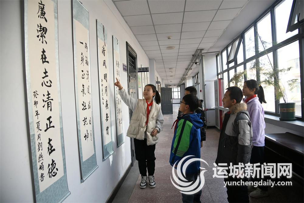 12月13日,聞喜縣城西小學學生在欣賞清廉文化主題書法作品。