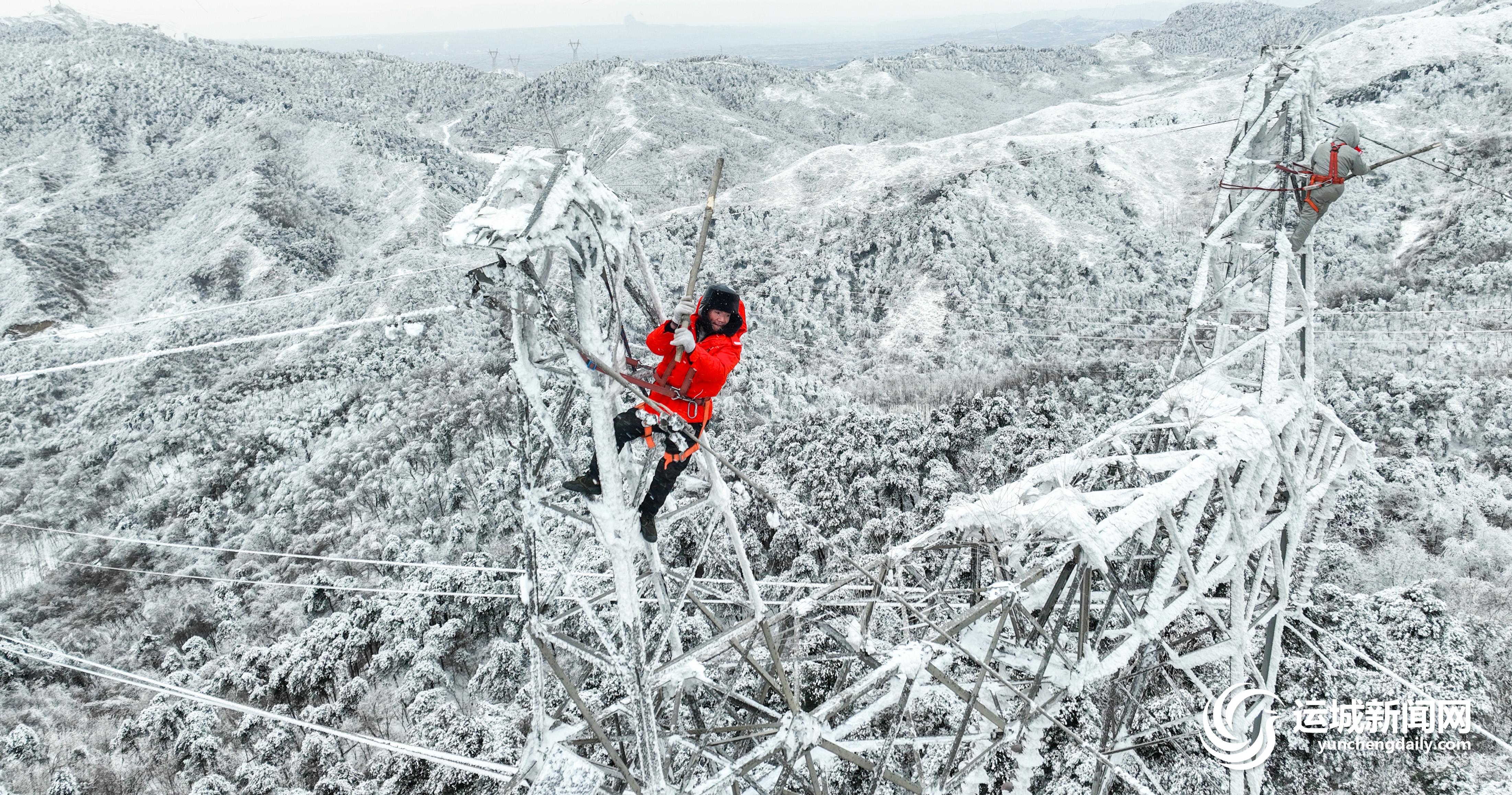 12月15日下午1時(shí),大風(fēng),氣溫零下12℃,聞喜縣后宮鄉(xiāng)中條山腹地220千伏桐垣Ⅰ線搶修現(xiàn)場(chǎng),工人在清除線纜上的覆冰。