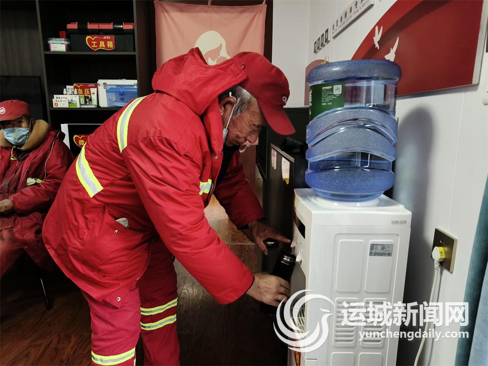 正當王冬珍忙活時,環衛工人劉豐收推門進入,拿起水杯接了一杯熱水,然后坐下準備休息一會?!拔邑撠煹氖歉浇灞P路上的衛生,這不已經打掃完一遍了,杯子里水喝完了,來接杯熱水。”劉豐收說,他平時可以在驛站里歇腳、喝水、充電,很方便。