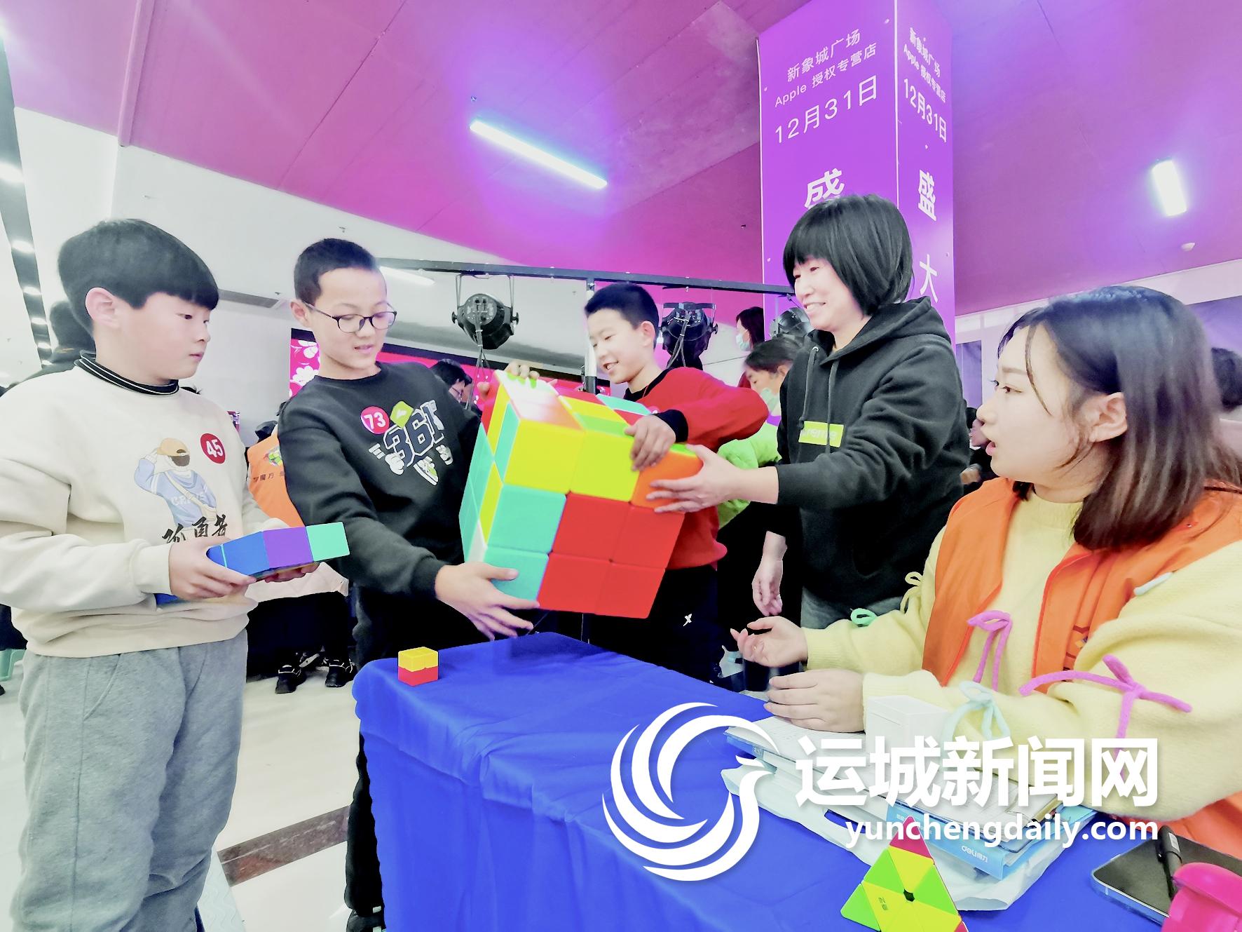 ▲1月1日,魔方老師與小選手交流。當日,在市區新象城商場一角,一場魔方競技正在進行,小選手們聚精會神、手眼配合,用最短的時間將手中的魔方復原。記者 景斌 攝