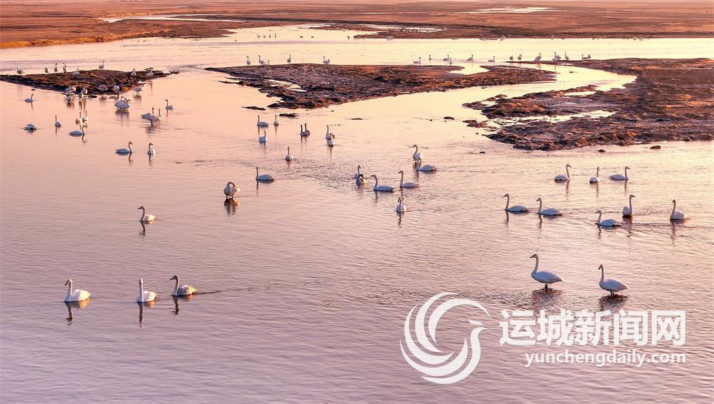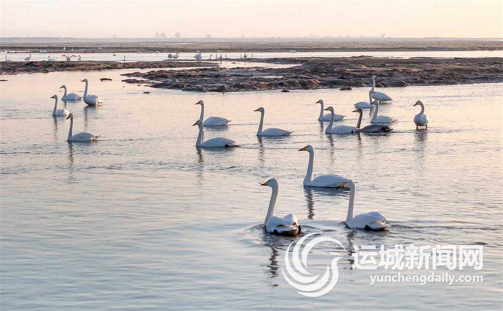 1月4日,在冬日暖陽下,黃河萬榮段陸續迎來了越冬的白天鵝。
