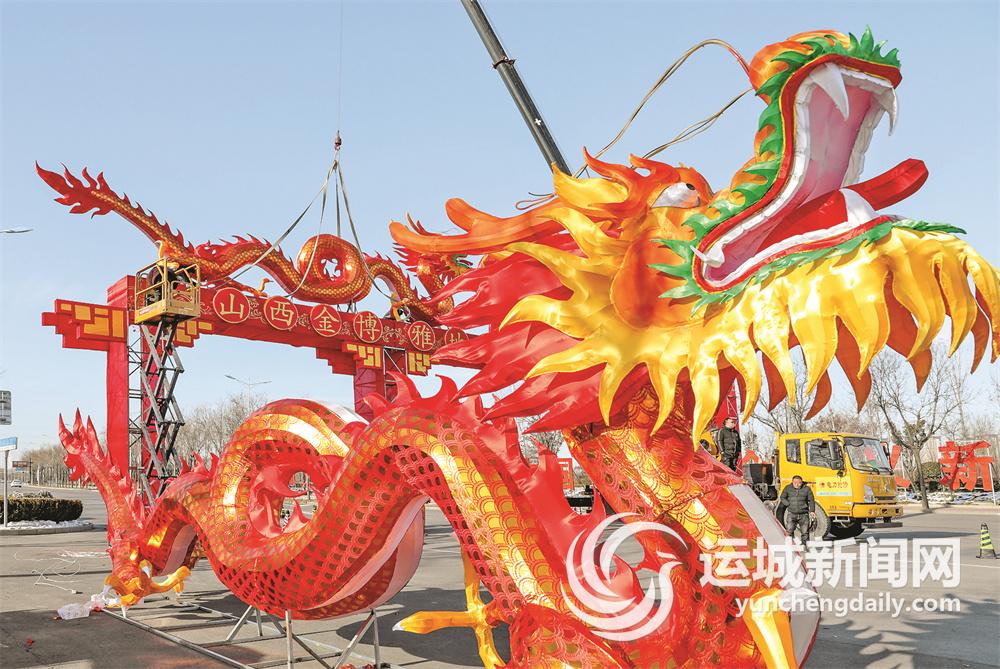 1月23日,中心城區運城東高速口,工作人員在吊裝龍形燈組。