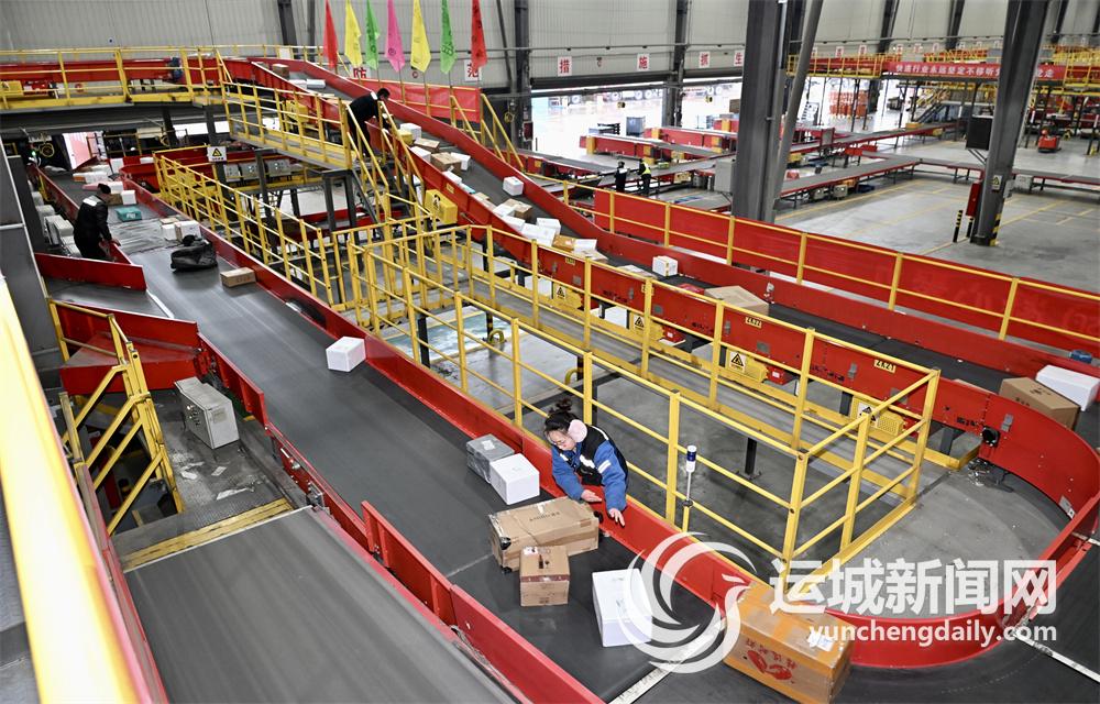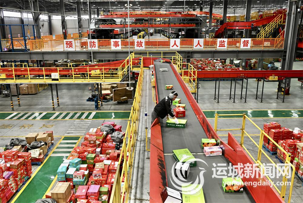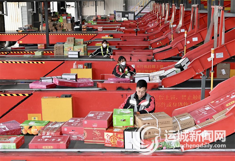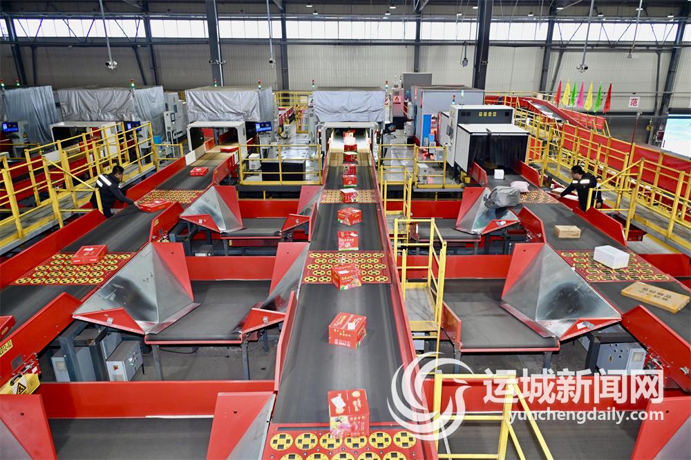 2月4日,在臨猗縣順豐物流公司楚侯中轉場內,工作人員在智能分揀作業線上忙碌。