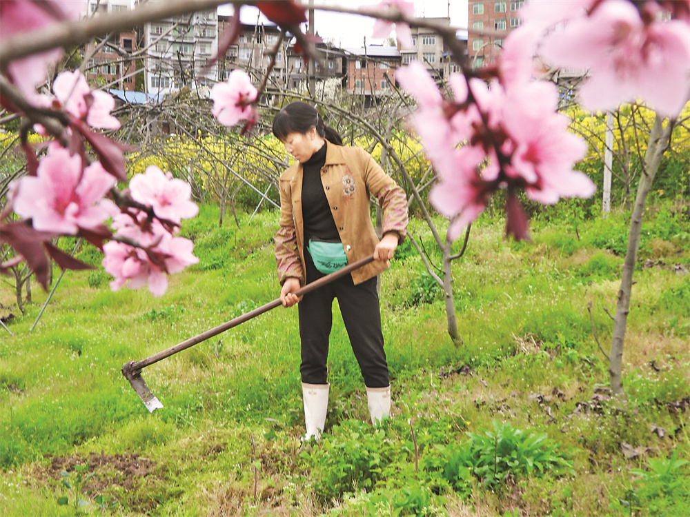 3月18日,在四川省達州市大竹縣廟壩鎮(zhèn)建福村,果農(nóng)在蜜桃種植基地勞作。 新華社發(fā)(鄧良奎 攝)