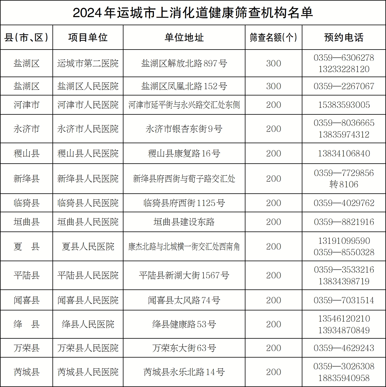 運城晚報訊(記者 景冬波 通訊員 耿世超)3月26日,運城市衛生健康委員會發布《2024年運城市上消化道健康篩查預約公告》(以下簡稱《公告》)。《公告》顯示,今年4月~6月,我市將對3000名40歲~69歲居民免費開展上消化道內鏡檢查,現已開始預約,預約電話及名額詳見右邊表格。