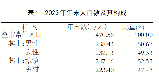2023年年末全市常住人口為470.56萬人,比上年末減少1.29萬人。其中,城鎮(zhèn)常住人口247.16萬人,占常住人口比重為52.53%,比上年末提高1.6個百分點。全年出生人口2.89萬人,出生率為6.14‰;死亡人口4.36萬人,死亡率為9.26‰;自然增長率為-3.12‰。