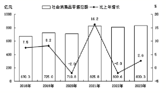 全年全市社會消費品零售總額830.3億元,比上年增長2.6%。按經(jīng)營地統(tǒng)計,城鎮(zhèn)消費品零售額659.8億元,增長2.8%;鄉(xiāng)村消費品零售額170.5億元,增長1.8%。按消費類型統(tǒng)計,商品零售額749.4億元,增長1.9%;餐飲收入80.9億元,增長9.4%。