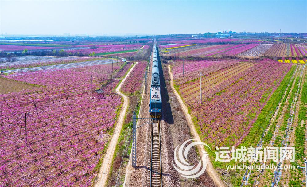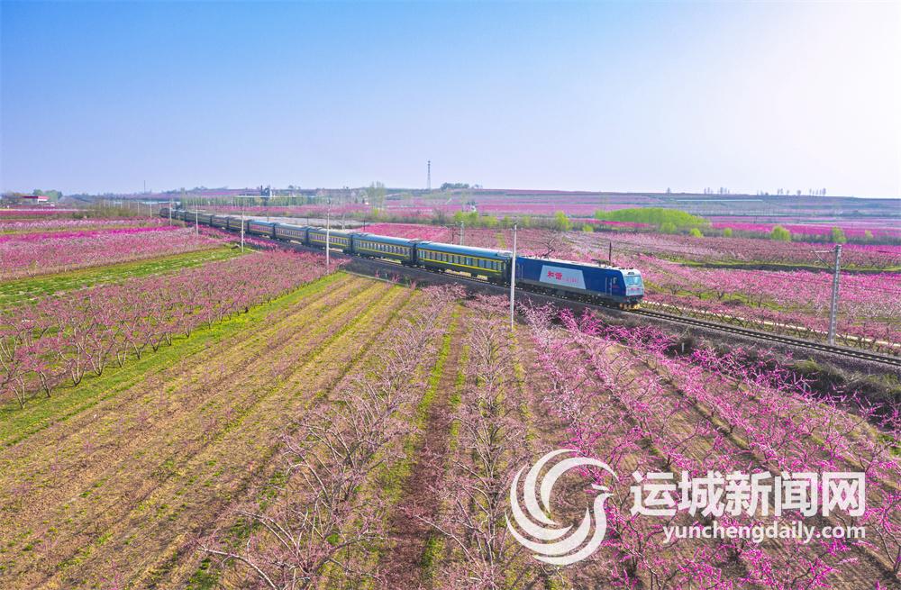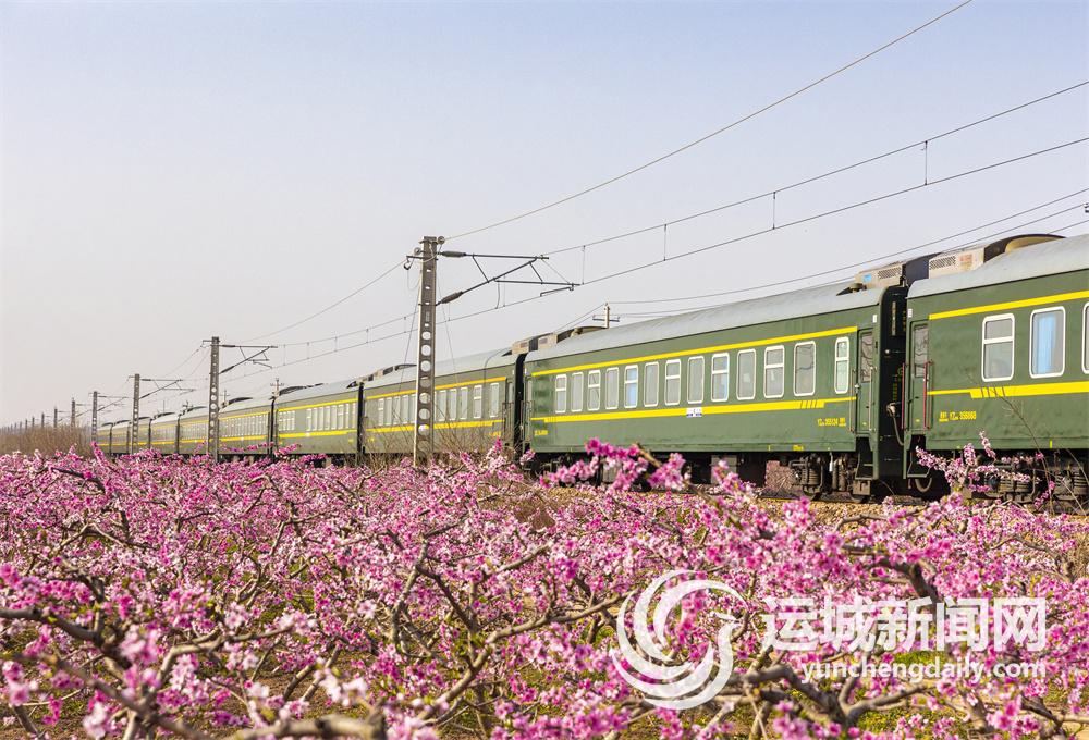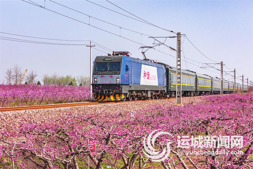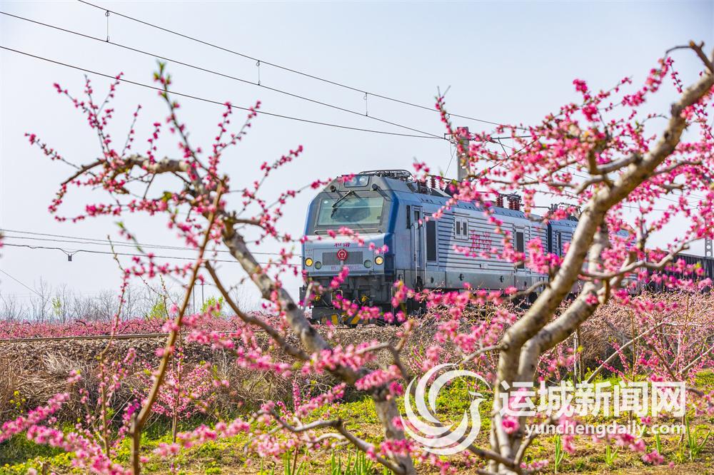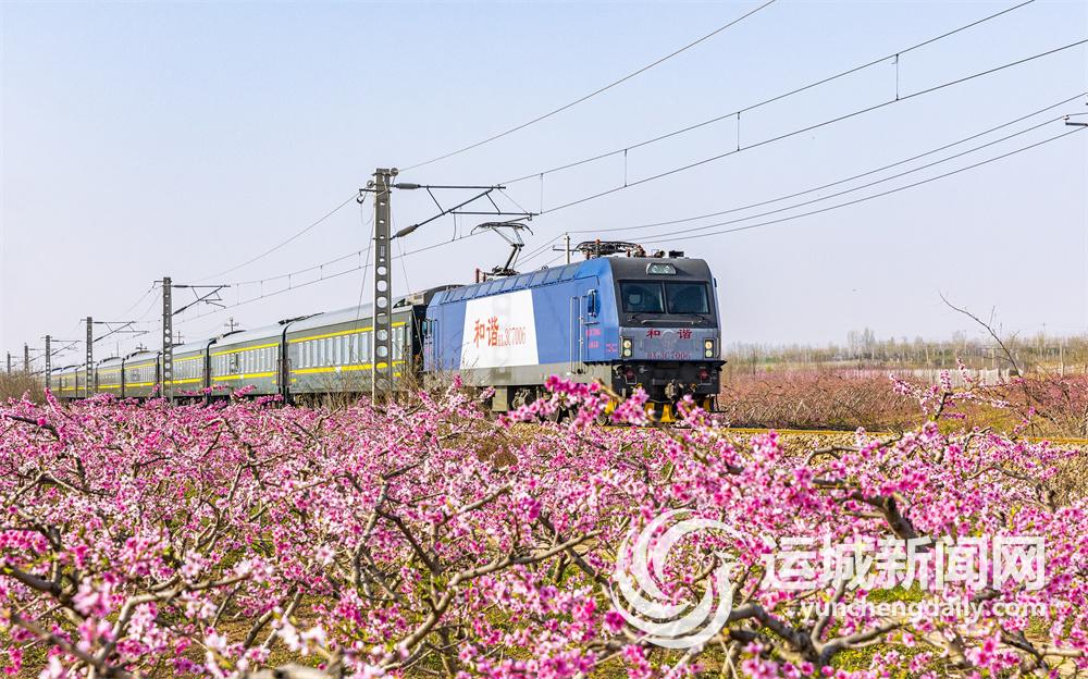 3月31日,位于鹽湖區境內同蒲鐵路沿線桃花嶺上,萬畝桃花競相綻放,花開正艷,“和諧號”客運機車在春日花海中穿梭,呈現出一幅春意盎然、美麗和諧的畫卷。