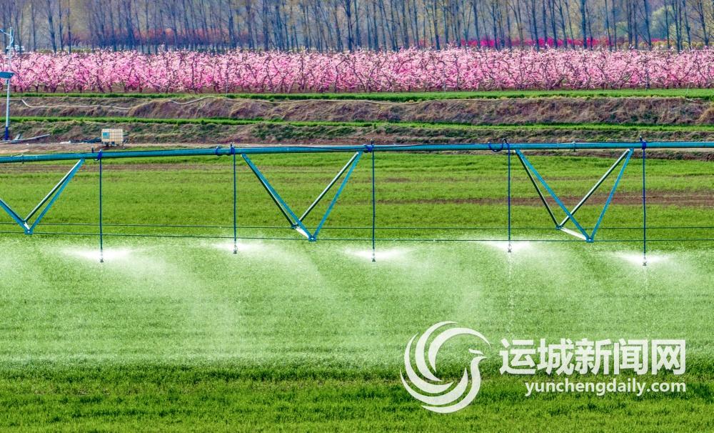 3月30日,在芮城縣東壚鄉黃河岸邊的遠鵬智慧農場里,農民利用現代化的桁架式自動噴灌機對冬小麥進行春澆。