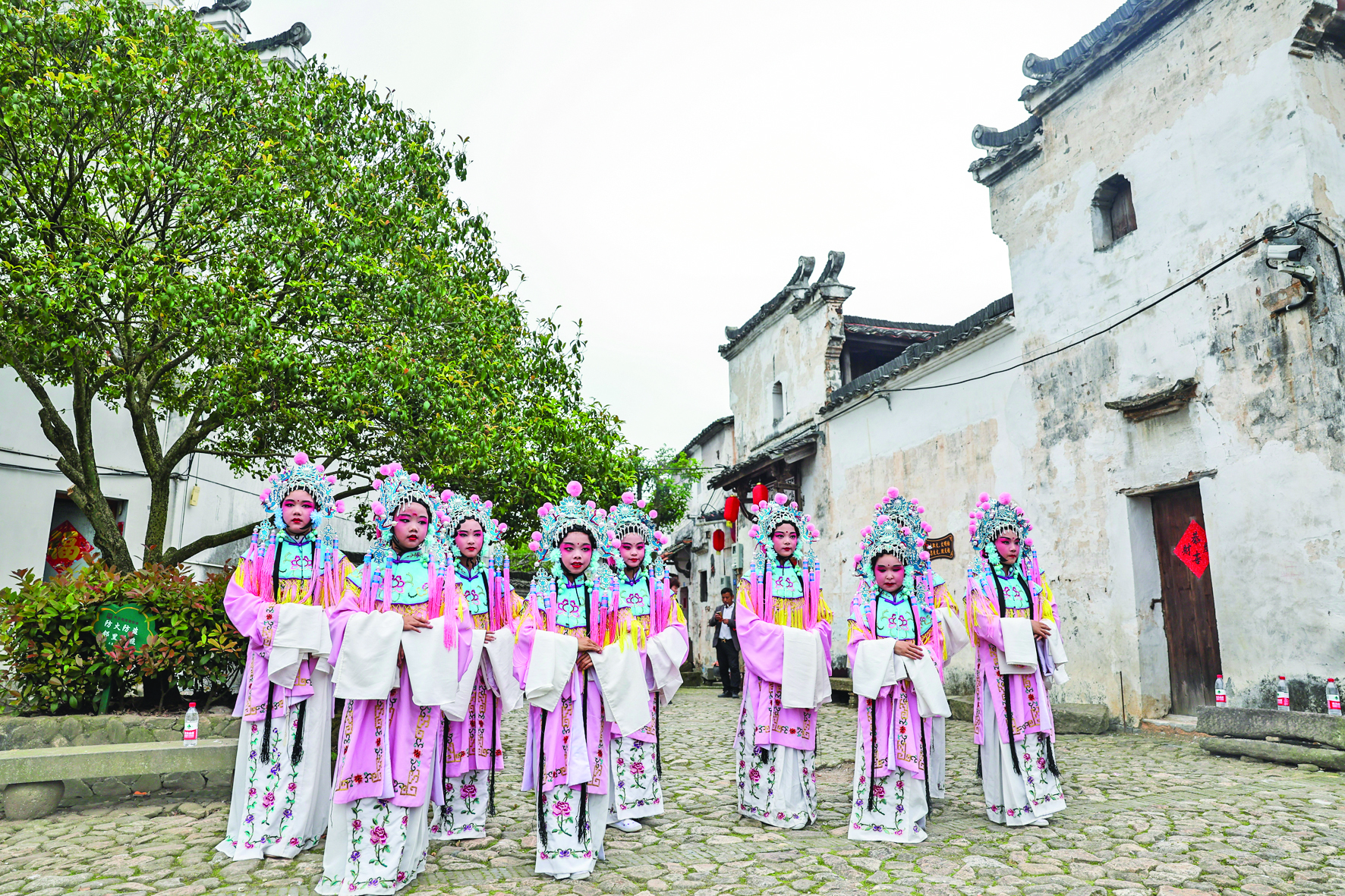 當(dāng)日,浙江省建德市大慈巖鎮(zhèn)新葉村舉行“新葉三月三”特色民俗非遺展演。建德、蘭溪、龍游三地的“李村抬閣”“新葉昆曲”“龍游硬頭獅子”“畬族竹竿舞”等十余項(xiàng)非遺傳統(tǒng)節(jié)目在新葉古村輪番上演。