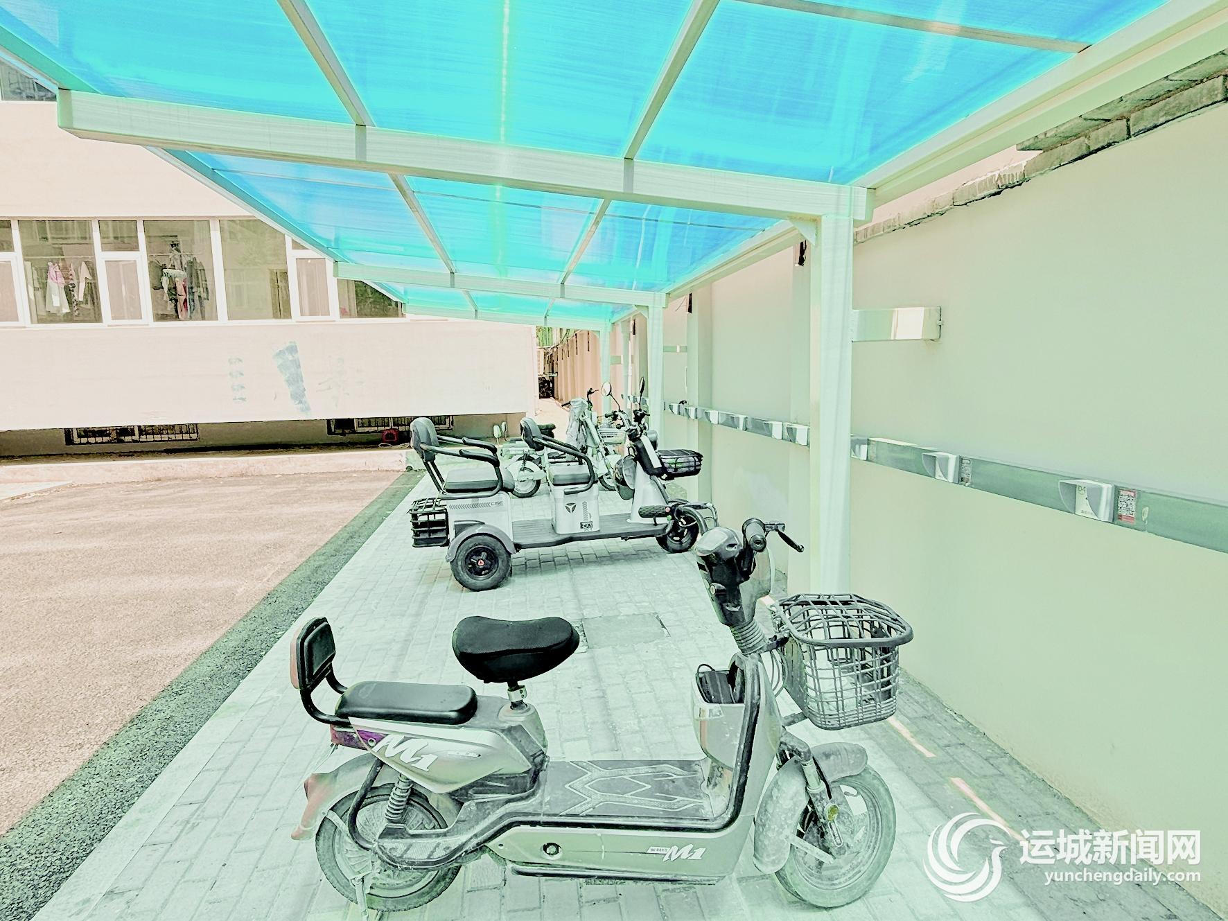 步入運師家屬院,映入眼簾的便是灰白相間的小區單元樓外墻,墻面干凈整潔、煥然一新,樓下配有幾處健身設施方便市民休閑鍛煉。沿著兩棟樓之間一路往前,瀝青道路平整寬闊,路面中間則化身為停車場,鋪設了磚塊,幾輛非機動車停放有序,周邊樹木綠籬交錯,綠化層次豐富。道路盡頭是一個一百余平方米的停車棚,里面同時配備了充電樁。