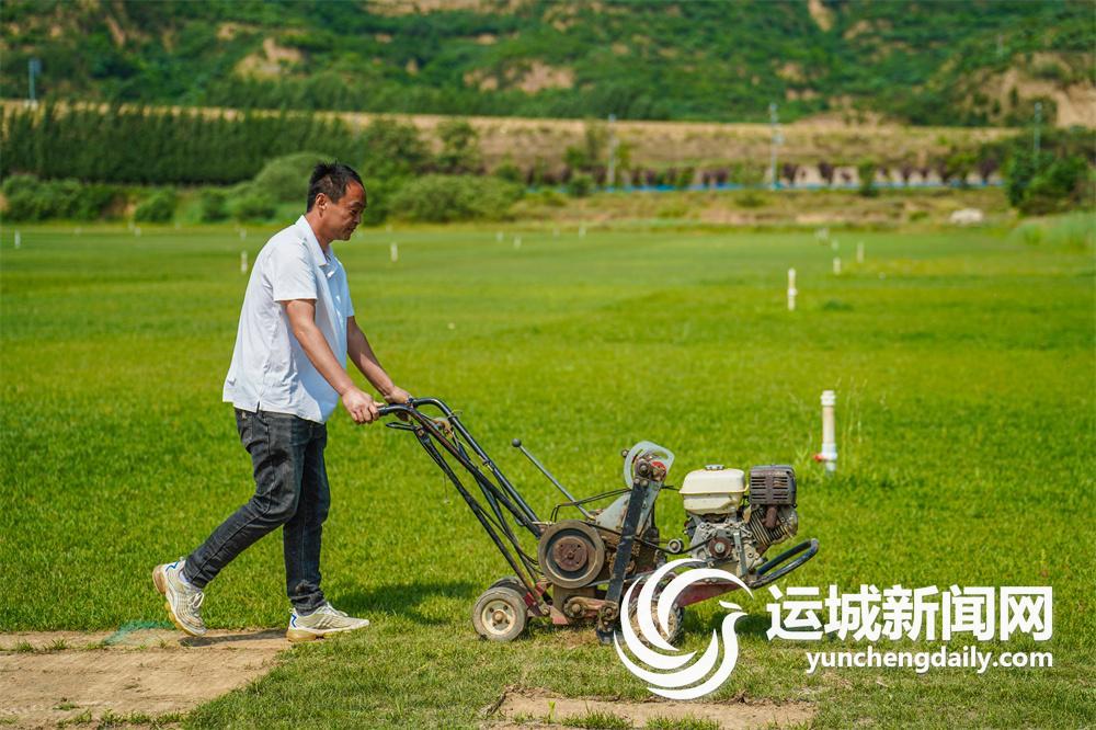 站在位于太陽渡村黃河灘涂的草坪種植基地,滿眼郁郁蔥蔥的綠色如畫卷般鋪展開來,其間一排排噴灌桿整齊地站立著,如同忠誠的衛士一般,守護著這片生機勃勃的綠意。