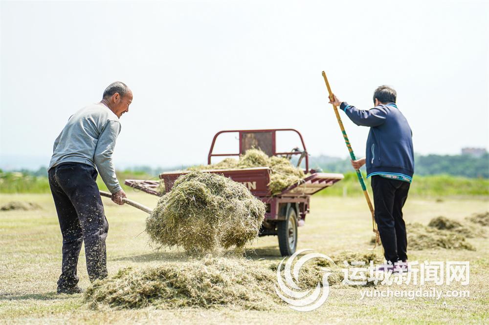 在鏟收完的草地上,太陽渡村的劉大媽和老伴在忙著收拾草屑,他們已經用竹耙把草屑耬成了很多小堆,然后再用鐵鍬把草屑鏟到小三輪車上。