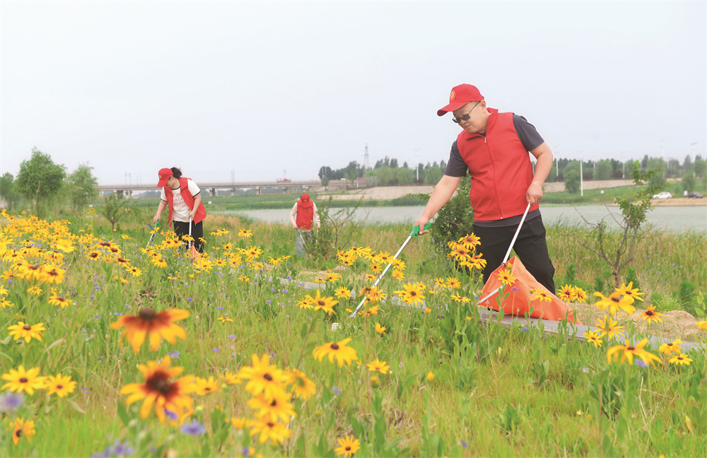6月5日,環保志愿者在河北省石家莊新樂市磁河木刀溝生態濕地撿拾垃圾。 新華社發(賈敏杰 攝)