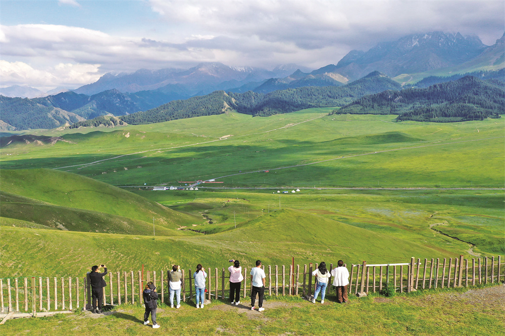 進入6月,位于新疆塔城地區沙灣市的鹿角灣景區迎來了最美時節。遙望冰封雪嶺,近看碧草繁花,天高地闊的美麗風光,令人仿佛置身童話世界。 新華社記者 丁 磊 攝