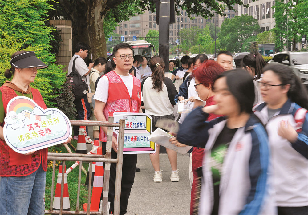 6月7日,浙江省杭州市長征中學(xué)考點外,杭州市拱墅區(qū)小河街道小河社區(qū)志愿者舉牌提醒人們保持安靜。