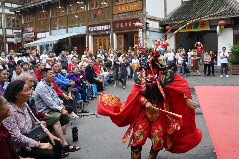 6月9日,人們在四川省內江市東興區東興老街欣賞川劇變臉。