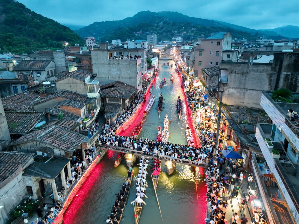 6月9日,福建省福州市長(zhǎng)樂區(qū)三溪村夜賽龍舟民俗活動(dòng)如約而至。隨著夜幕降臨,三溪村民及遠(yuǎn)道而來的龍舟愛好者們組成的龍舟隊(duì)馭舟飛馳,揮槳競(jìng)渡,南溪兩岸及石橋上人潮如涌,熱鬧非凡。
