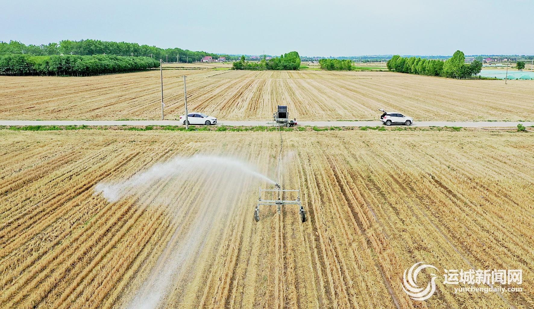 6月14日,夏縣胡張鄉王學種植家庭農場利用噴灌機為農田澆水。為確保玉米、谷子等秋作物出苗生長,該縣采取井水抽澆、拉管擴澆、噴灌滲澆等方式,全力抗旱保苗。特約攝影 張秀峰 攝