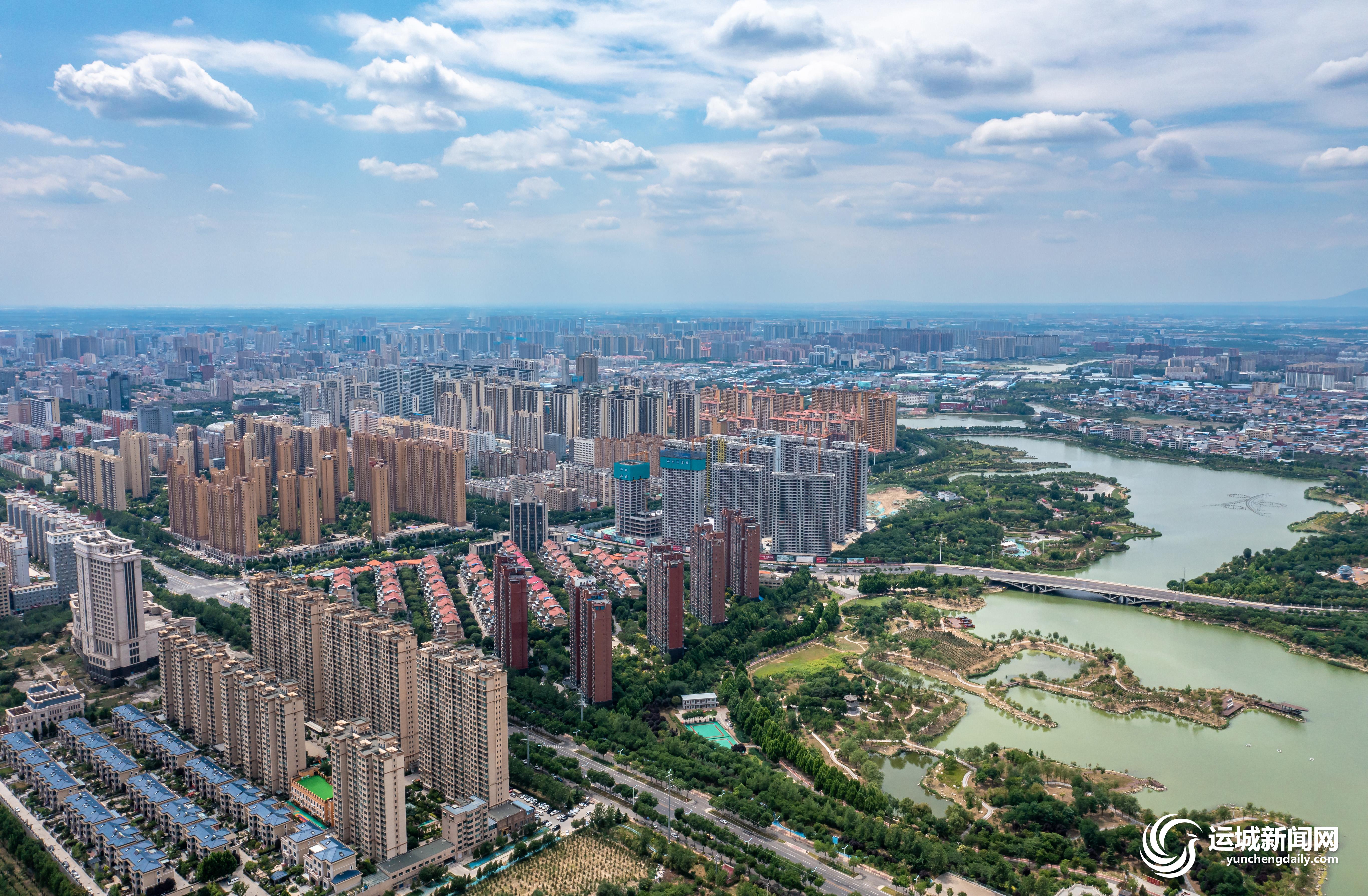 6月15日,我市中心城區城市水系與建筑群相映成趣,在藍天白云的映襯下,構成一幅水清景美城相融的生態畫卷。
